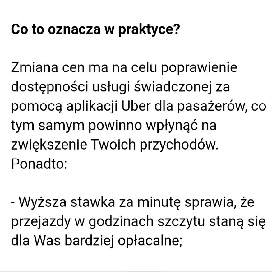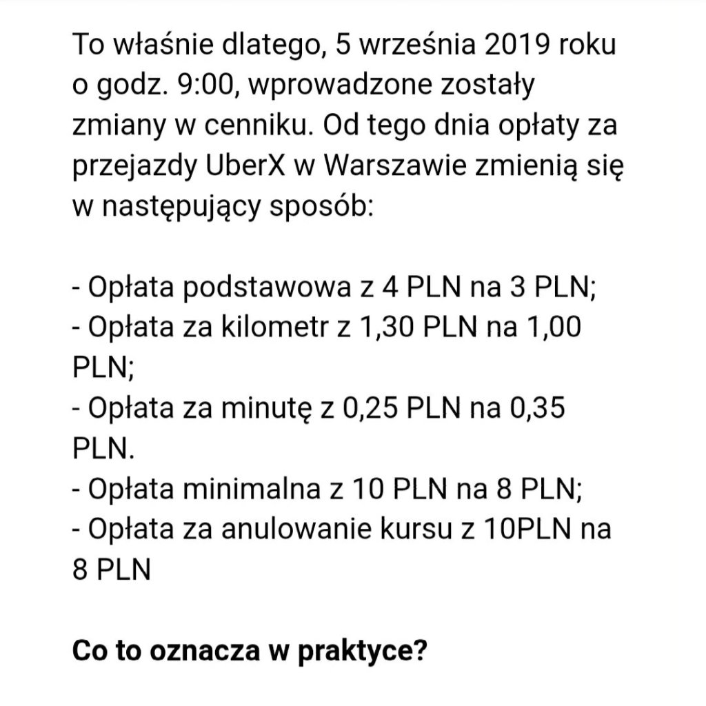 Prowizja, myto dla Uber bez zmian, ale stawka za kilometr 1zł ! 🙂