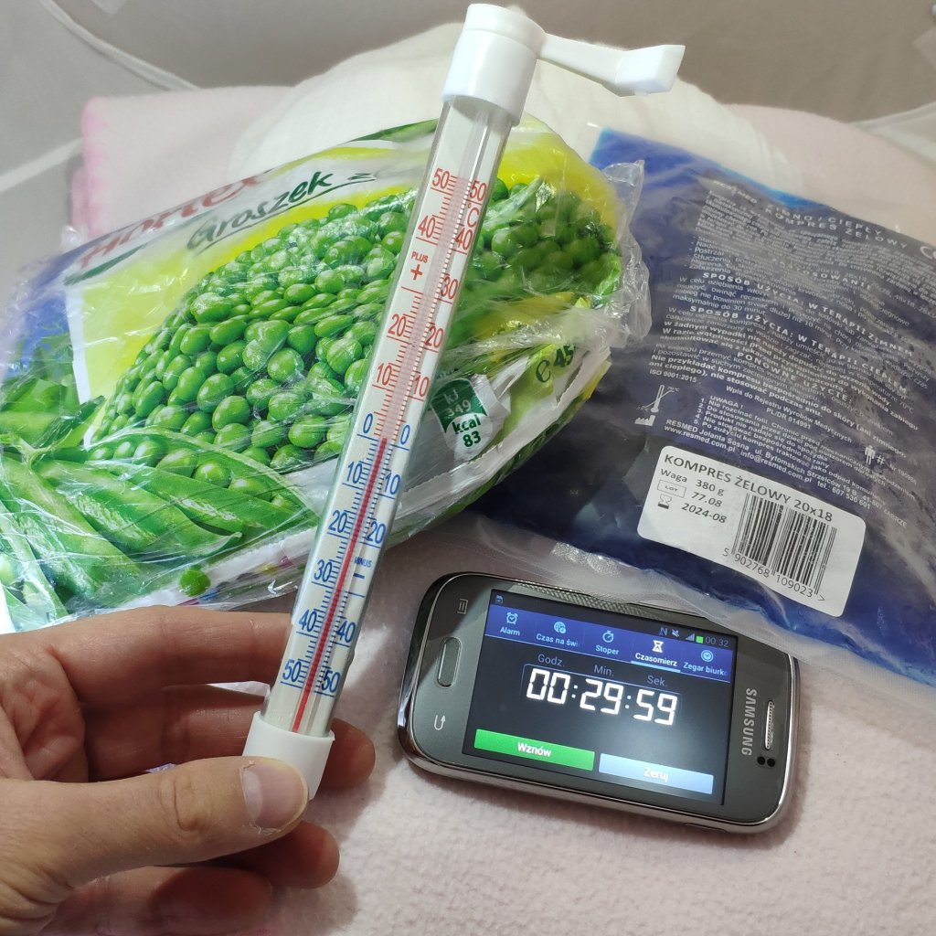 możemy iść do apteki i kupić kompres żelowy lub iść do sklepu spożywczego i kupić na przykład mrożony groszek zielony