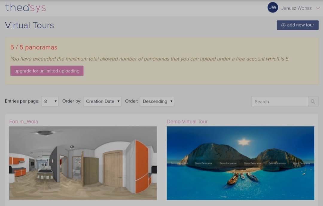 Mając 5 takich panoram w Theasys możemy za darmo zrobić i opublikować spacer wirtualny.